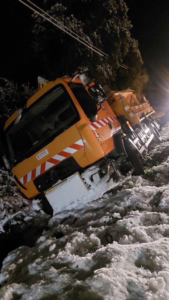 La Vendée a subit un épisode neigeux (qui en avait été précédé d’un autre 10 jours plutôt) qui a débuté le la nuit du 5 au 6 janvier, pour se terminé le 7 janvier dans la matinée, soit une quarantaine d’heure. Une petite pluie verglaçante est tombée suivie rapidement de neige la nuit du lundi au mardi. Puis, après une accalmie le mardi, une pluie verglaçante est tombée mercredi matin. Si cela a amusé « la Vendée qui s’amuse » équipée de 4X4 ou qui sont restés chez eux à admirer le spectacle, par contre « la Vendée qui bosse » avec leurs humbles modestes voitures se sont retrouvés au fossés sous le regard désemparé des agents. Faute de sel, des agents ont été invités à rester au centre, voir à proposer un seau de sel aux naufragés dans les fossés.